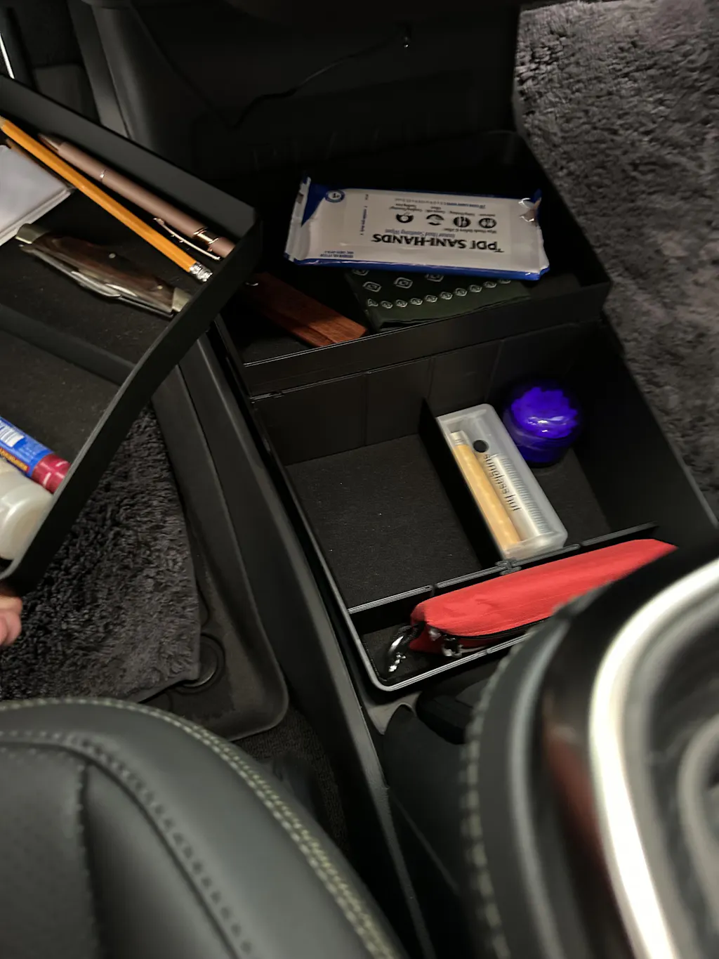 The floor center console organizer is a split into 2 levels. At the lower level you can choose between XL cupholders or dividers. The top level provides additional storage for smaller items, while simultaneously conceals the items on the lower level.